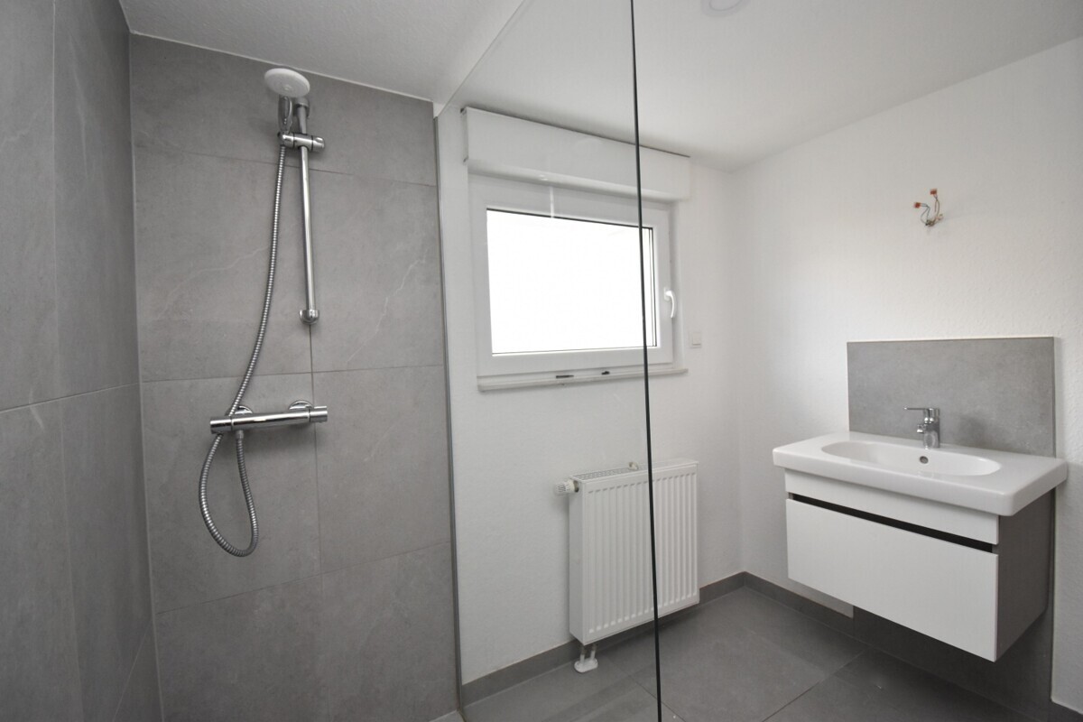 Das Badezimmer ist mit einer Dusche ausgestattet und bietet genügend Raum für Waschmaschine und Trockner.